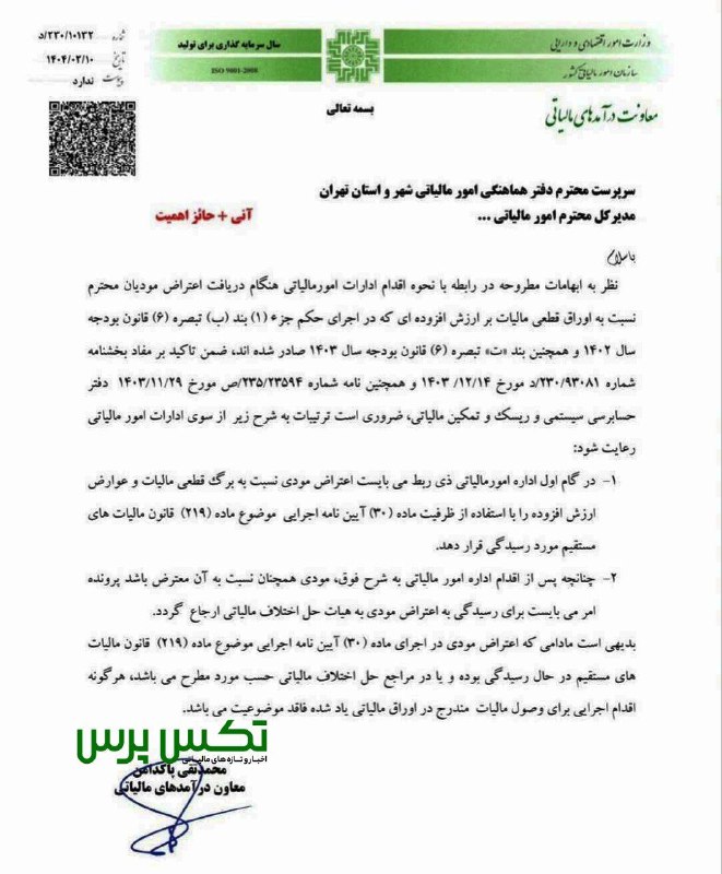 ابلاغیه مورخ ۱۰/ ۲/ ۱۴۰۴ معاون درآمدهای مالیاتی سازمان امور مالیاتی در خصوص نحوه اقدام ادارات امور مالیاتی در رابطه با اعتراض مودیان نسبت به اوراق قطعی ارزش افزوده صادره در راستای حکم قانون بودجه سال ۱۴۰۳