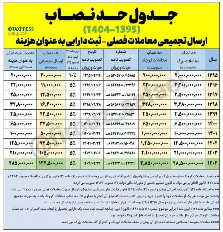 جدول حدنصاب ارسال تجمیعی معاملات فصلی ثبت دارایی به عنوان هزینه