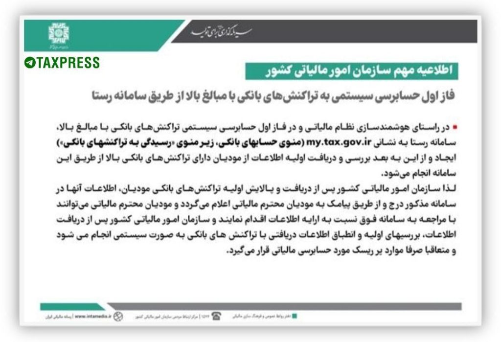 04 آگوست اخبار, اخبار مالیاتی فاز اول حسابرسی سیستمی به تراکنشهای بانکی با مبالغ بالا از طریق سامانه رستا توسط ad.kavoshacc 0 دیدگاه 1404/05/13 - 09/12/00 AM در راستای هوشمندسازی نظام مالیاتی و در فاز اول حسابرسی سیستمی تراکنشهای بانکی با مبالغ بالا، سامانه رستا ب... ادامه مطلب
